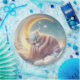 Um gatinho branco fluffy dorme pacificamente berrado pela lua crescente, envolto num cobertor rosa macio