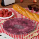 Pratos de papel de textura metálica vermelho burgundy com padrão de lábios beijando.