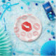 Esta placa de papel divertida apresenta vários impressões de batom vermelho em um fundo branco.