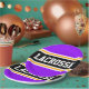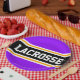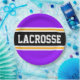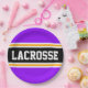 Este esportivo, design atlético, apresenta dentro de texto LACROSSE ousado, uma faixa preta larga realçada com faixas duplas brancas e amarelas contra faixas brilhantes de fundo roxo. O texto neste design pode ser personalizado.