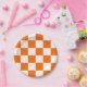 Placa de papel com um padrão de verificação laranja e branco. Perfeito para qualquer reunião.