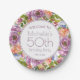 Placas de papel personalizadas para a 50ª festa de aniversário feminina, desenhadas num lindo floral roxo, laranja e aquarela azul com folhas verdes e fundo branco. Entre em contato conosco para obter ajuda com a personalização ou para solicitar produtos correspondentes.
