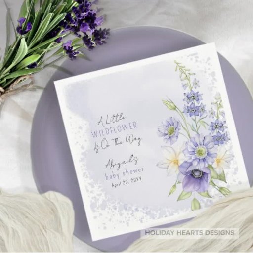 Flores silvestres de lavanda bonito em um fundo de planalto de cor d'água são o pano de fundo perfeito para seus acessórios de festas do Bebê Sprinkle sobre este design de borboleta "A Little Wildflower Is On The Way". Design composto por Designs Holiday Hearts.