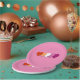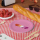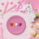 Paper plates with hearts in colors of lesbian pride flag, pride design on a pink background; orange, white, and pink hearts