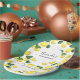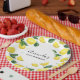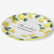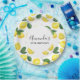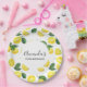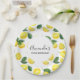Chapas de papel de aniversário/de evento com um padrão fofo de limões amarelos com folhas verdes e fatias de limão cortadas frescas. Um círculo branco colocado sobre o topo com a sua dentro de texto.