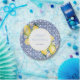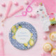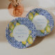 Limões pintados à mão em aquarela contra um padrão de fundo baseado em um azulejo azul e branco vintage. Se preferir o círculo central com uma borda lisa (em vez de recortada), esta opção está disponível. Sob as caixas de texto de personalização, "clique para personalizar ainda mais" e vá para a área "camadas" e desmarque a camada "oval" e oculte a camada do círculo recortado.