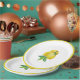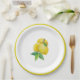 Design divertida com um aglomerado de limões amarelos com folhas verdes brilhantes. As placas têm um contorno amarelo ensolarado ao redor da borda. Coloque estes com os guardanapos de papel correspondentes para uma configuração de na moda para os seus convidados.