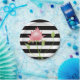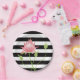 Um lindo lótus rosa floresce graciosamente sobre um fundo listrado preto e branco. Esta design funciona bem para muitos tipos de comemorações de aniversários a chás de panela, casamentos, almoços de jardinagem, recepções e muito mais.