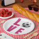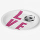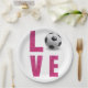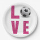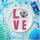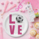 Love Soccer word design com letras faíscas cor-de-rosa quente e o "o" é substituído por uma bola de futebol.