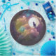 O sol colorido as nuvens surreais no céu em azul, roxo, rosa e amarelo nesta ilustração fofa do espaço exterior. Um gato negro se senta na lua crescente olhando para as estrelas com fascínio. Ela vai alcançar e tentar pegar um?