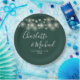 Pratos de papel para casamento em verde esmeralda elegante com luzes de corda bonitas, nomes no estilo da assinatura e a data especial do seu casamento. Desenhado por Thisisnotme©