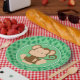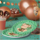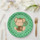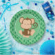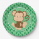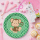 Esta placa do partido caracteriza um fundo verde com um teste padrão de repetição das folhas da selva. Um marrom bonito do clipart do bebê e um macaco tan sentam-se no centro da placa.