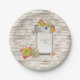 Pratos de papel bonitos com fundo de tábuas de madeira rústica, jar de pedreiro e Hens and Chicks. Personalize com seus nomes e data.