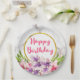 Placas de papel de aniversário com um design elegante - uma textura de mármore falsa em branco constitui o fundo. A camada sobre o topo é uma moldura com uma borda falsa de folha de ouro. Flores grandes, cor-de-água, cor-de-rosa e roxa, magnólias, com sotaques verdes, enfeitam o design.