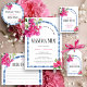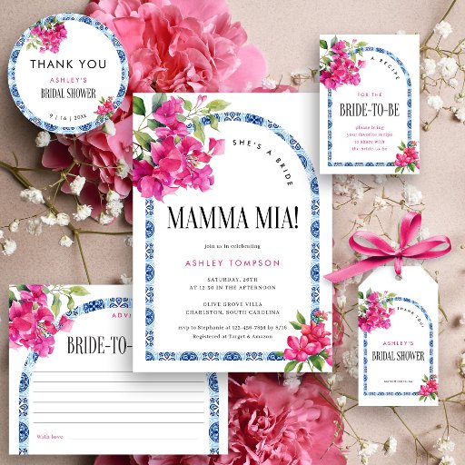 Esta Coleção apresenta um deslumbrante arco de azulejos italianos azuis inspirado no charme mediterrâneo, rodeado por flores cor-de-rosa vibrantes em aquarela para um toque vibrante e romântico. A tagline divertida "Mamma Mia!" adiciona um clima alegre e comemorativo, definindo perfeitamente o tom para um chá de noiva elegante e inesquecível. Este design combina elegância clássica com um charme caprichoso, ideal para uma celebração de verão ou temática italiana. Por favor, entre em contato conosco para obter ajuda no design através do Zazzle Chat ou envie um e-mail para stephanyanddany@gmail.com. Respondemos dentro de 12 horas.