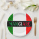 Esta placa de partido personalizada contém a frase "mangiare" impressa no centro. Mangiare é a tradução italiana para "comer" e é impressa nas cores da bandeira italiana. As três primeiras letras são verdes, as duas são brancas e as três últimas são vermelhas. Está impresso na bandeira italiana.