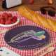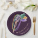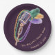 Serve your festive treats on these vibrant Mardi Gras paper plates. This design features a retro jazz microphone draped in carnival beads and feathers. A perfect addition to your Fat Tuesday table setting. Durable and customizable with your name or event date.