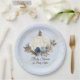 "Marinho Blue Floral Dourado outono Pumpkin Boy Paper Plate & Party Decor." Fundo azul pastel pálido com azul de marinho queda elementos florais e estrelas douradas brilhando ao redor da abóbora branca. A design é completada por verde em folhas de outono de som de terra muda. Mão pintada em aquarela pela artista internacionalmente licenciada Audrey Jeanne Roberts. Conjunto completo disponível para coordenar. Direitos autorais.