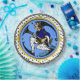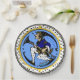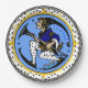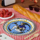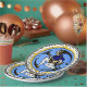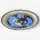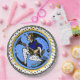 Legal adição para o seu jantar de férias e para oferecer os seus bens caseiros, esta placa de papel exclusiva e divertida do Chanucá apresenta a variação original de Jewbilee de um elfo de Maxfield Parrish anterior à WWI com leggings de bolinhas branca e preta, um menorah no seu calçado e a saudação de "Feliz Chanucá" em um pano de fundo do periwinkle, acabado com/ tabuleiro & chechinho Anéis exteriores de bolinhas e triângulos amarelos brilhantes.