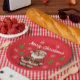 Celebrate the season with this cheerful and traditional round Christmas plate! This cute design features a friendly cartoon Santa Claus front and center, framed by classic green Christmas trees and whimsical white snowflakes. The bold red background and simple "Merry Christmas" text make this a charming addition to any Christmas party.