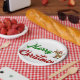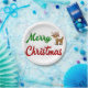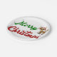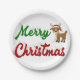 Placas de papel com Feliz Natal em letras verdes e vermelhas 3D e uma rena. Chapas disponíveis em vários tamanhos.