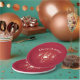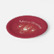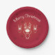 Uma ilustração feliz de Natal. Um desenho animado de renas, giro e adorável. Fundo vermelho festivo com flocos de neve caindo.
