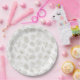 A delicate seamless floral pattern paper plate featuring elegant line art illustrations of wildflowers, leafy stems, and tiny berry branches on a clean white background. This minimalist botanical design uses soft neutral tones and fine outlines to create a calm, modern aesthetic.