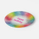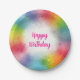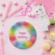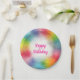 Placa de papel redonda clássica para festas & suprimentos para festas / Suprimentos para festas / Louças / Papel e pratos de festa / Modelo de texto de aniversário feliz com script colorido personalizado em rosa moderno, vermelho, amarelo, laranja, azul e verde.