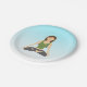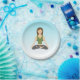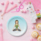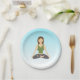 Ilustração de uma linda garota morena fazendo ioga. A mulher está sentada na posição tradicional de lótus. Ela está vestindo um tanque verde e calças de cinza escuras. O fundo é um adorável gradiente azul.