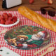 Um prato de Natal personalizado com um cão sentado no colo do papai noel e dizendo-lhe o que o seu natal deseja.