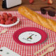A letra T... um monograma, cortado com o feriado holly e fita amarrados em um arco, é oferecida em cores tradicionais...e enfeita esta placa de papel, fazer contribuição do eterno para o seu decoro de mesa de férias! Esta design tem uma borda vermelha de morango correspondente. Personalize com seu nome de família. Esta design adorável será uma parte clássica da sua comemoração de Férias!