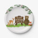 Kid's birthday party paper plate with the theme of rustic woodland and forest animals.
