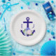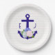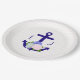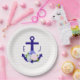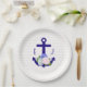 Nautical anchor and monogram framed by a lightened version of patriotic florals: white rose, blush pink peony and light blue. Preppy pink and white stripes for a summer, beach, or destination wedding event.
