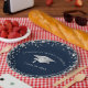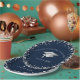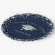 This modern design features a graduation hat and confetti in silver on a background of navy blue with white text.