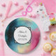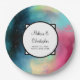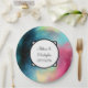 Placas de papel personalizadas para o evento de casamento com um design legal e na moda. As aquarelas se misturam e se misturam para criar a ilusão de uma imagem espacial. Verde com espirais de púrpura, amarela e vermelho-claro misturados com uma mistura de pontos brancos e estrelas. Uma criação artística elegante.