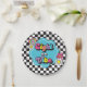 O retrô de Neon 90 é um prato de papel de 8 anos com corações, margaridas, bola de disco e fundo de damas.