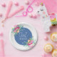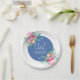 Pratos de papel personalizados para casamento com as iniciais do casal com belos acentos florais rosa e centro azul com fonte branca. Tema de casamento floral elegante.