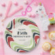 Flor retrógrada com armação redonda em placa de papel de fundo em linhas onduladas verdes, vermelhas e pretas. Fornecimentos de festas perfeitos para a festa de aniversário de temas retrorados.