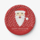 A ilustração de desenho de Destei de uma cabeça de Papai Noel com uma expressão de rosto feliz. A cor de fundo é vermelha com um padrão de pontos brancos. Há também um texto que diz "Feriados Felizes!" junto com uma área de texto personalizável para o nome do evento.