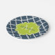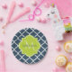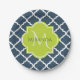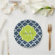 Placas de papel padronizadas de quatrefoil azul-marinho elegante com um crachá escalpado em um verde-primavera vibrante que você pode personalizar adicionando seu nome e monograma inicial. Esta é parte da Coleção de Primaveras Azul e Almoço de Limão.