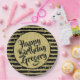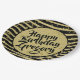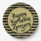 Celebre seu aniversário com essas pratos de papel preto e listrado de ouro divertidos. O padrão geométrico da moda é um padrão simples de listras preto e dourado com confetti. Há um círculo dourado no centro para o seu texto e um modelo de texto para que você possa alterá-lo facilmente para suas próprias palavras, nome ou evento. Esta design é adequada para todas as ocasiões, incluindo festas de aniversário, chás, aniversários, graduações e muito mais; basta mudar o texto para corresponder ao evento.