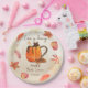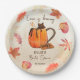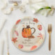 O amor está fervilhando no outono, chuveiro de noiva monogramado personalizado impresso em pratos de papel decorados com mesa personalizada, xícara de café de abóbora e especiarias, folhas de bordo, pratos para chuveiro de noiva de outono