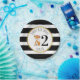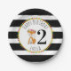 Placas de papel do aniversário que caracterizam uma ilustração de uma raposa do bebê que veste uma coroa da flor. O fundo é listras preto e branco com design do pom do pom. Personalize o nome e o número