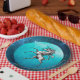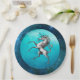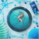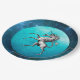 Ilustração unicórnio do estilo heráldica prateada do pewter ventilado no disco de cor d'água azul com fundo celeste mais escuro.