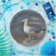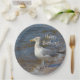 Estas placas de papel do aniversário caracterizam uma gaivota que olha para fora para Long Island do parque estadual de Hammonasset em Madison, Connecticut.