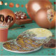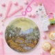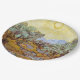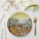 Oliveiras com céu amarelo e sol. Vincent Willem van Gogh. Paisagem em tons amarelo quente. Grande jardim com árvores grandes. Montanhas no fundo. Há um grande sol brilhante no céu. Reprodução de famosas imagens de arte no dominio público.