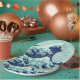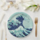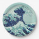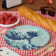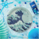 Trata-se de um desenho de ondas marítimas extremas azuis, cianas e aquamarinas com espuma e spray, baseado no trabalho de Katsushiki Hokusai (1760-1849).