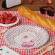 Add a sweet and playful touch to your party table with these adorable paper plates featuring a sleepy pink kitty, party hat, tiny birthday cake, striped background, and vintage-style frame details. Perfect for a charming cat-themed 1st birthday celebration.