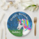 Adicione brilho à sua mesa de festas com estas placas mágicas de papel de aniversário do Unicórnio! Projetado com um unicórnio branco giro e um macho e cauda de cor arco-íris em tons negros de rosa, roxo, turquesa e amarelo, o design é acentuado com um trompa ouro e faíscas mágicas. Perfeito para bolo de aniversário, salgadinhos e diversão festiva! Arte original de Suki - Direitos autorais