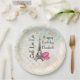 Placas de papel de aniversário felizes personalizadas com um adorável padrão de safra com rosas esmaecidos e outros elementos decorativos. Camadas sobre o topo é uma ilustração da torre do Effel e Ooh La de lado. Uma impressão de batom rosa-quente deixada ao lado do famoso marco com o texto xoxo!